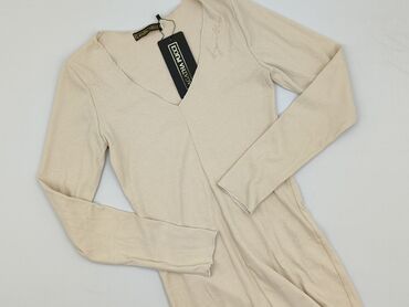 Sukienka dzianinowa Agatha Pucci – damska - Fason: dopasowana, midi, z długim rękawem - Dekolt: w kształcie litery V - Kolor: beżowy/ecru w drobny prążek - Materiał: 80% bawełna, 20% elastan – ela...Stan: