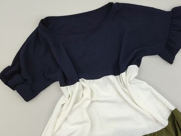 - Wzór/kolor: trójkolorowa sukienka w blokach kolorystycznych – granatowa góra, biały środkowy pas, oliwkowy dół z marszczeniami.