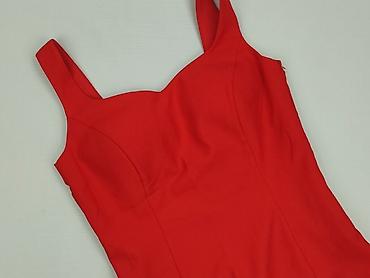 Czerwona sukienka damska z połyskującą górą - Krój: bez rękawów, dekolt w kształcie łuku, rozkloszowany dół do kolan. - Góra: elastyczna siateczka z geometrycznym wzorem i błyszczącymi kwadratowym...
