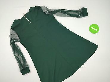 Sukienka damska, zielona, z długim rękawem. - Fason: prosta, lekko trapezowa, z dekoracyjną zakładką/zaszewką z przodu, długość mini/za kolano (w zależności od wzrostu). - Dekolt: okrągły. - Zap...