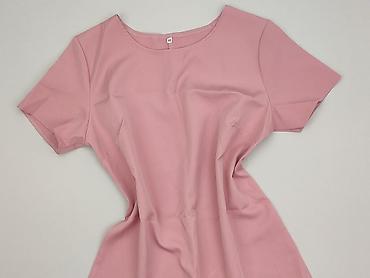 Sukienka damska w kolorze pudrowego różu - Fason: prosta, ołówkowa, długość przed kolano - Dekolt: okrągły - Rękawy: krótkie z falbanką - Materiał: 95% poliester, 5% elastan (metka na zdjęciu) - R...