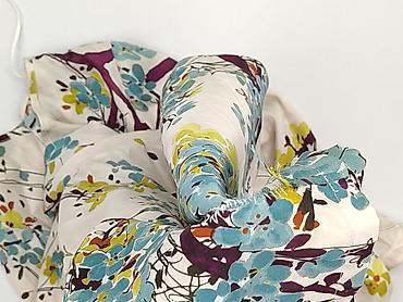 - Wzór: kwiatowe gałązki w odcieniach turkusu, żółci i fioletu na jasnym tle