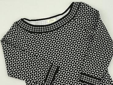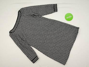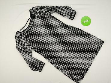 - Kolor/wzór: czarno‑biały, geometryczno‑kwiatowy print na całej powierzchni; przy dekolcie i mankietach kontrastowa lamówka z drobnym wzorem