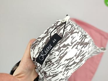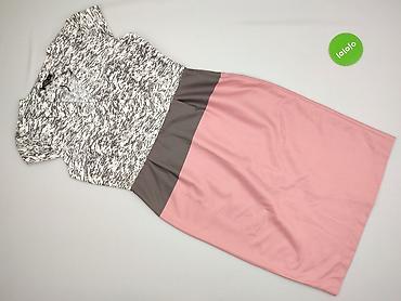- Wzór i kolor: góra w szaro-biały abstrakcyjny print, w talii kontrastowy pas w kolorze grafitowym, dół gładki pudrowy róż