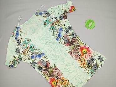 - Wzór: bogaty, kwiatowy nadruk w odcieniach turkusu, niebieskiego, różu, koralu, szarości i zieleni, rozmieszczony po bokach i na dole, optycznie wysmuklający sylwetkę