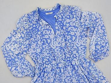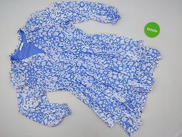 Sukienka damska z długim rękawem, rozmiar L. - Fason: kopertowy dekolt w serek, delikatnie odcięta w pasie, lekko rozkloszowany dół z falbaną. - Wzór: granatowo-niebieski nadruk w drobne, nieregula...