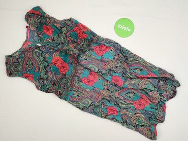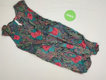 Sukienka damska JNDSKA, rozmiar M - Krój: zwiewna, z krótkim rękawem, rozszerzana ku dołowi - Zapięcie: rząd guzików z przodu (fioletowe) - Wzór: gęsty, kwiatowy nadruk w odcieniach granatu, niebi...