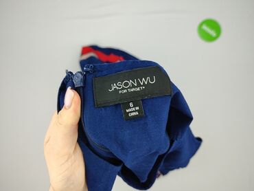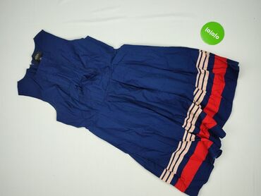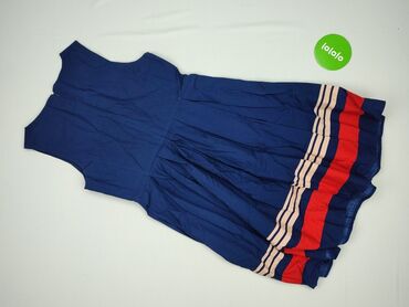 Sukienka damska w granatowo-białe paski, charakteryzująca się krótkimi rękawami i okrągłym dekoltem. Fason z odcięciem w talii i lekko rozkloszowaną spódnicą z marszczeniami. Sukienka zapinana z ty...