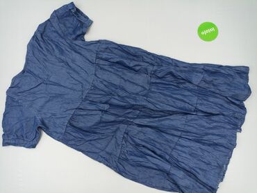 Sukienka damska z lekkiej tkaniny, kolor niebieski melanż (denimowy look). - Krój: luźny, odcinana w pasie, długość do kolan. - Dekolt: w kształcie litery V, ozdobiony falbankami w ciemniejszym ...