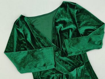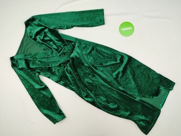 Sukienka damska w kolorze butelkowej zieleni z subtelnym połyskiem siateczki. - Krój: kopertowa góra z zakładkami, odcięcie i delikatne marszczenie w talii, rozkloszowany dół. - Rękawy: długie, z ...