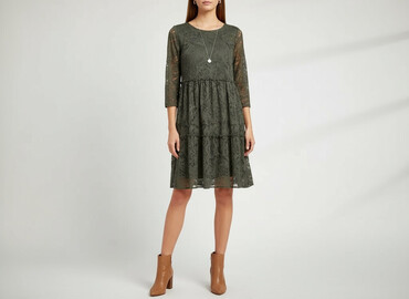 Sukienka w kolorze khaki z koronkowymi detalami. Model z dekoltem w kształcie litery V i krótkimi rękawami, podkreślającą talię gumką i rozkloszowanym dołem. Koronkowe wstawki dodają jej lekkości i...
