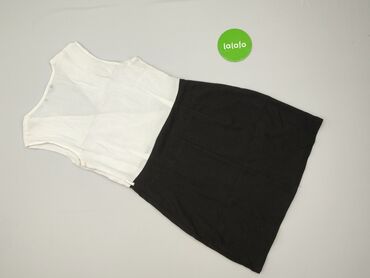 Sukienka damska bez rękawów, czarno‑biała, rozmiar S. - Krój: dopasowana góra z geometrycznymi, kontrastowymi wstawkami w kolorze białym; dół ołówkowy do kolan. - Dekolt: okrągły. - Zapięcie: dług...