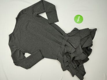 - Fason: dopasowana góra z okrągłym dekoltem i długim rękawem; efektowny, kaskadowy dół z wieloma falbanami tworzącymi asymetryczne wykończenie.