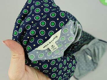 Sukienka MAX STUDIO - Fason: dopasowany, długość do kolan - Rękaw: do łokcia - Dekolt: łódka - Wzór: gęsty, kwiatowy print w odcieniach granatu, bieli i błękitu; ozdobne, poziome pasy na dekolcie,...Stan: