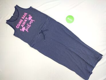 Sukienka damska bez rękawów, midi/maxi, w marynarskie paski. - Kolor: granatowy w wąskie białe paseczki - Nadruk na piersi: różowy napis “COME SAIL AWAY with me” z motywem flamingów - Fason: prosty...Stan: