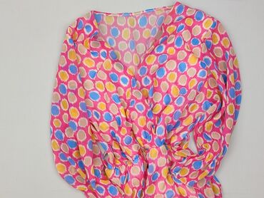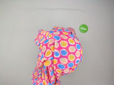 - Wzór i kolory: nieregularne okrągłe plamki w odcieniach niebieskiego, żółtego i beżowego na intensywnie różowym tle.