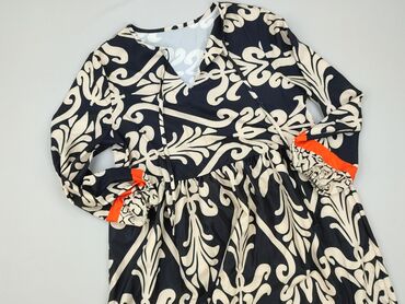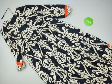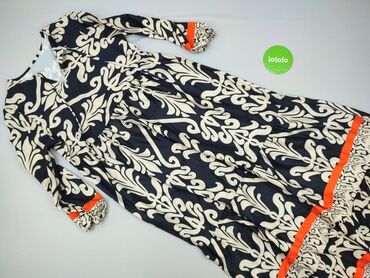 - Wzór: duży, ornamentalny print w kolorze ecru na ciemnym granatowo-czarnym tle; na dole sukienki ozdobna listwa w kolorze pomarańczowym.