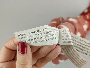 - Pielęgnacja według metki: prać ręcznie w chłodnej wodzie, nie wybielać, nie suszyć w suszarce; prasować w niskiej temperaturze; unikać prania chemicznego