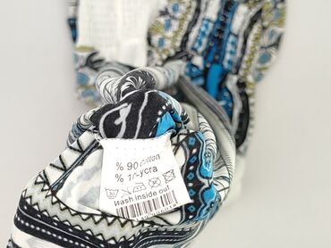 - Kolor/Wzór: biała baza z wyrazistym, etnicznym nadrukiem w odcieniach turkusu, niebieskiego, czerni, szarości i oliwkowej zieleni.