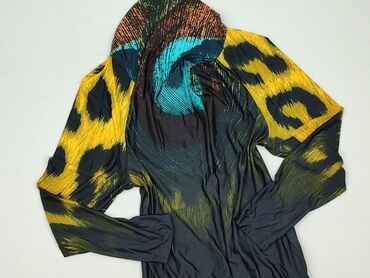Sukienka BASTET, rozmiar 42 - Fason: midi z długim rękawem, lekko dopasowana w talii szerokim, elastycznym pasem; dół z delikatnym marszczeniem/bombką. - Wzór i kolor: wyrazisty, artystyczny print...