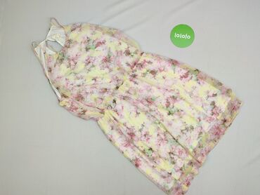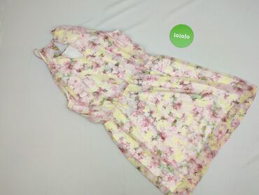 Damska sukienka w rozmiarze M/L, idealna na różne okazje. Charakteryzuje się żywym, kwiecistym wzorem dominującym na jasnożółtym tle, z widocznymi odcieniami różu, czerwieni, zieleni i błękitu. Suk...