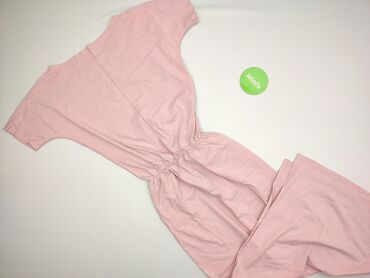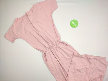 Sukienka midi w kolorze pudrowego różu z kwiatowym nadrukiem - Rozmiar: L (metka na rękawie) - Materiał: 100% poliester (informacja z metki) - Fason: rozkloszowany dół z drobnymi zakładkami, podkr...