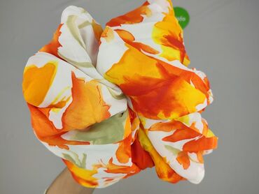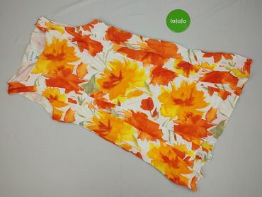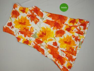 - Wzór: duże, malarskie kwiaty w odcieniach pomarańczu, żółci i zieleni na białym tle.
