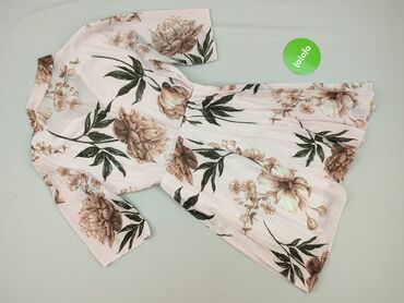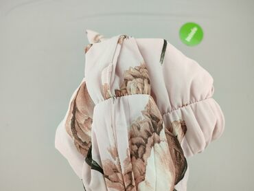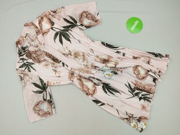 Sukienka midi w kolorze pudrowego różu z kwiatowym nadrukiem - Rozmiar: L (metka na rękawie) - Materiał: 100% poliester (informacja z metki) - Fason: rozkloszowany dół z drobnymi zakładkami, podkr...