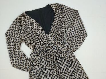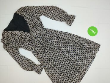 Na co dzieńSukienka damska z długim rękawem, wzór geometryczny (łańcuszki) w kolorach granatu i beżu. Dekolt w kształcie litery V, kopertowa góra z marszczeniem pod biustem, elastyczna talia podkreślająca sylwetkę. Rękawy zakończone mankietem z lekką falbaną. Długość za kolano (midi). Tkanina lekko lejąca, z podszewką w górnej części.