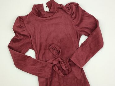 Sukienka damska w kolorze bordowym - Krój: lekko dopasowana, odcięta i marszczona w talii, długość przed kolano - Rękaw: długi - Dekolt: subtelne wycięcie w kształcie łezki z zapięciem na guzik z ...Stan: