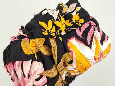 - Wzór: tropikalny print z liśćmi i kwiatami w odcieniach różu, żółci i beżu na czarnym tle