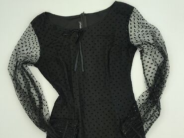 Czarna sukienka mini z tiulową górą i rękawami - Fason prosty, długość przed kolano - Przód i dół z gładkiej, kryjącej dzianiny - Góra, dekolt i długie rękawy z delikatnego tiulu w groszki - Okrąg...