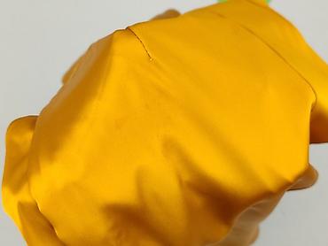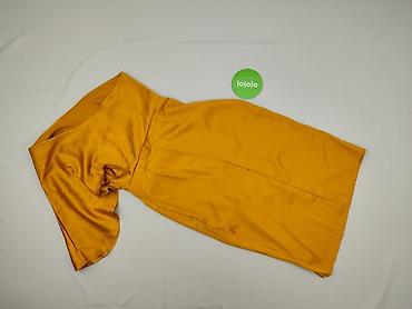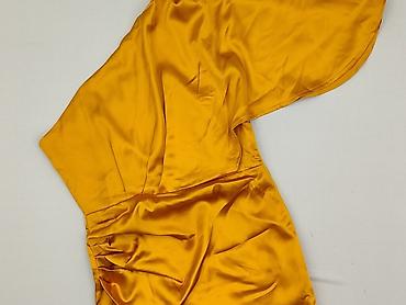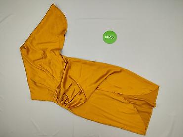 Sukienka damska, rozmiar S, kolor musztardowy/żółty. Fason midi z połyskiem, z efektownym jednym rękawem typu kimono/skrzydło oraz kopertowym dołem z rozporkiem. Delikatne marszczenia po boku podkreślające talię i biodra.