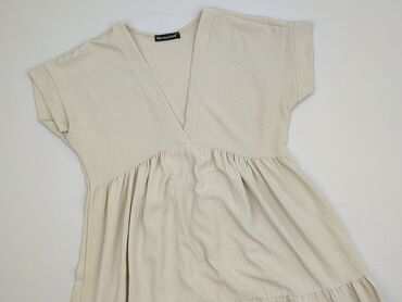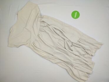 Sukienka damska „NEW COLLECTION” w kolorze jasnym kremowym/ecru. - Fason: odcinana w talii, z rozkloszowanym dołem - Góra z prążkowanej dzianiny, dół z gładkiego, lejącego materiału - Krótki rękaw...