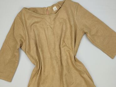 Sukienka midi z miękkiego, zamszowego w dotyku materiału w kolorze karmelowym/musztardowym. - Fason: dopasowany, długość za kolano. - Rękawy: 3/4. - Dekolt: szeroki, zaokrąglony z przodu. - Tył: ...