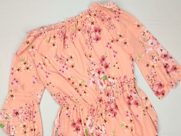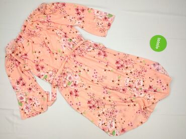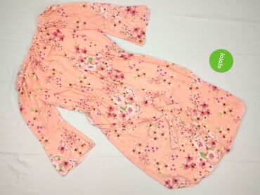 Sukienka damska midi w kolorze brzoskwiniowym z kwiatowym nadrukiem. - Góra z ażurowej koronki o falistym wzorze, okrągły dekolt, krótkie rękawy. - Dół z miękkiej dzianiny z nadrukiem dużych stokr...