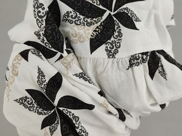 Sukienka damska z lekkiej tkaniny, biała w dekoracyjny, okrągły wzór w odcieniach czerni i pudrowego różu, z delikatnym, roślinnym motywem w tle. - Krój: luźny, swobodny, z zaznaczoną talią (lekko...Stan:
