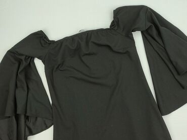 Czarna, dopasowana sukienka z długim rękawem. - Fason: obcisły, podkreślający sylwetkę, długość mini. - Dekolt: głęboki, zaokrąglony z przodu i z tyłu. - Materiał: elastyczna, prążkowana dzianina (...