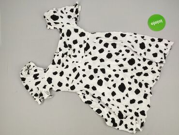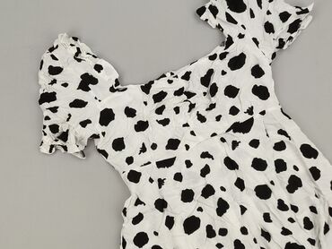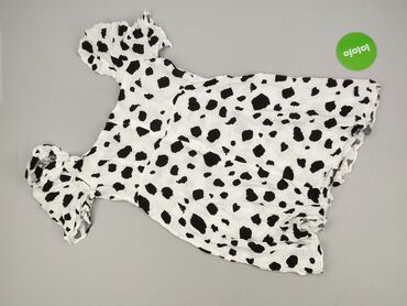 Damska sukienka mini z krótkim rękawem, w czarno-biały wzór w cętki. Posiada kołnierzyk i rozpinane guziki, tworząc dekolt w kształcie litery V. W talii znajduje się elastyczne marszczenie, które p...Stan: