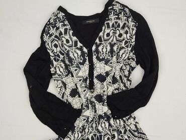 Sukienka mini damska marki Reserved w rozmiarze M. Charakteryzuje się długim rękawem i okrągłym dekoltem. Wzór na całej powierzchni to geometryczne motywy w czarno-białej kolorystyce, nadając sukie...