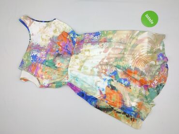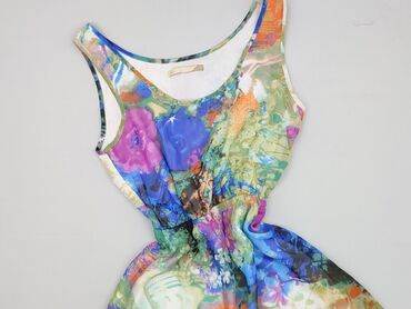 Sukienka damska bez rękawów z kolorowym, akwarelowym nadrukiem - Fason: dopasowany do sylwetki, lekko taliowany, długość przed kolano - Dekolt: pod szyję (okrągły), obszyty białą lamówką - Talia: ...
