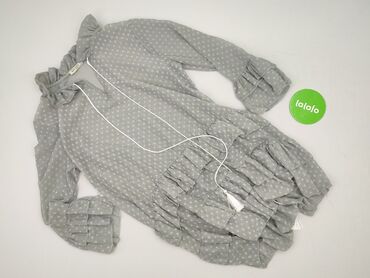 - Fason: luźny, z marszczeniami i wielopoziomowymi falbanami u dołu; długie rękawy zakończone szerokimi, falbanowymi mankietami