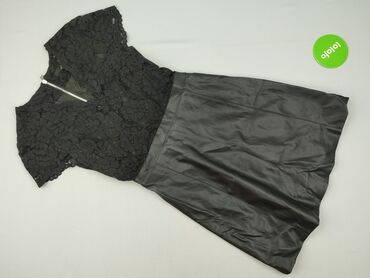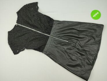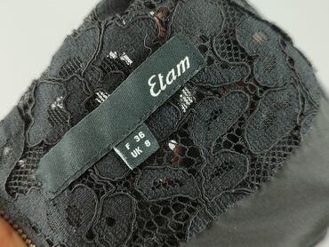 ŚwiętaCzarna sukienka mini Etam o dopasowanym fasonie, łącząca górę wykonaną z delikatnej koronki z krótkim rękawem i dekoltem w kształcie litery V, z rozkloszowanym dołem z imitacji skóry. Sukienka zapinana jest na zamek błyskawiczny. Lekka i elegancka, idealna na wieczorne wyjścia lub specjalne okazje.