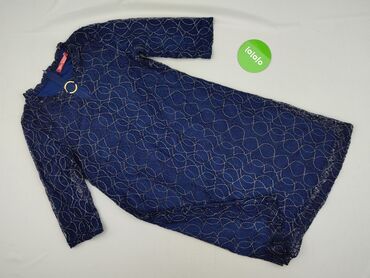 Sukienka damska, granatowa, prosta i elegancka. - Fason: ołówkowy/tuba, długość do kolan (około). - Rękawy: krótkie, z koronkowymi wstawkami na ramionach. - Dekolt: okrągły. - Materiał: gładka, el...