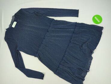 Sukienka damska z połyskiem, dzianina lurex - Fason: dopasowany, mini/midi (wydłużony dół z marszczeniem po bokach) - Rękaw: długi - Dekolt: zabudowany (okrągły) - Kolor: ciemny granat z drobnym, ...Stan: