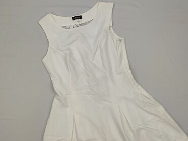 Sukienka damska, biała, mini/krótka, z krótkim rękawem. Elegancki fason dopasowany, model z zaszewkami i delikatnym drapowaniem w talii, które podkreśla sylwetkę. Na jednym rękawie aplikacje z ceki...
