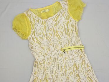 Koronkowa sukienka w kolorze intensywnej żółci. - Fason: dopasowana góra z podkreśloną talią, rozkloszowany dół do kolan. - Materiał: ażurowa koronka o kwiatowym wzorze na podszewce w tym samym ko...
