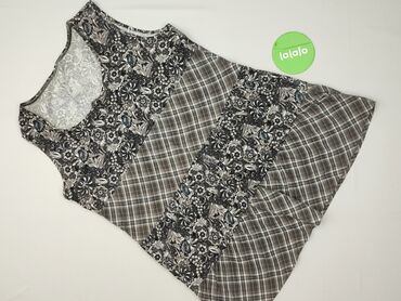 Sukienka damska bez rękawów, w drobny biały kwiatowy deseń na szarym tle. - Krój: prosty, lekko taliowany, długość przed kolano (mini/krótka). - Dekolt: okrągły. - Materiał: lekki, miękki, nieelas...