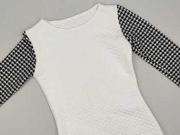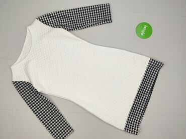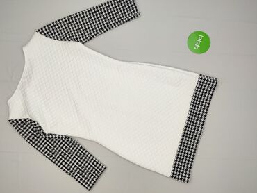 Sukienka damska z krótkim rękawem, czarno-biała, dzianinowa. - Fason: prosta, delikatnie dopasowana, długość przed kolano. - Przód: panel z wzorem w kratę/pied-de-poule w odcieniach czerni i bieli...Stan: