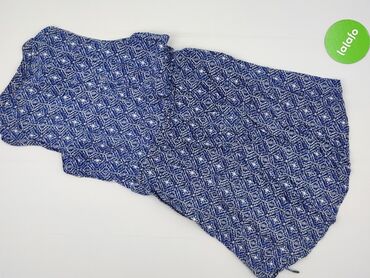 Sukienka damska bez rękawów, z niebiesko‑białym, etnicznym/ikatowym wzorem. - Krój: midi lub za kolano, delikatnie zwężana w talii, rozszerzana ku dołowi; okrągły dekolt. - Tkanina: lekka, przewi...Stan: